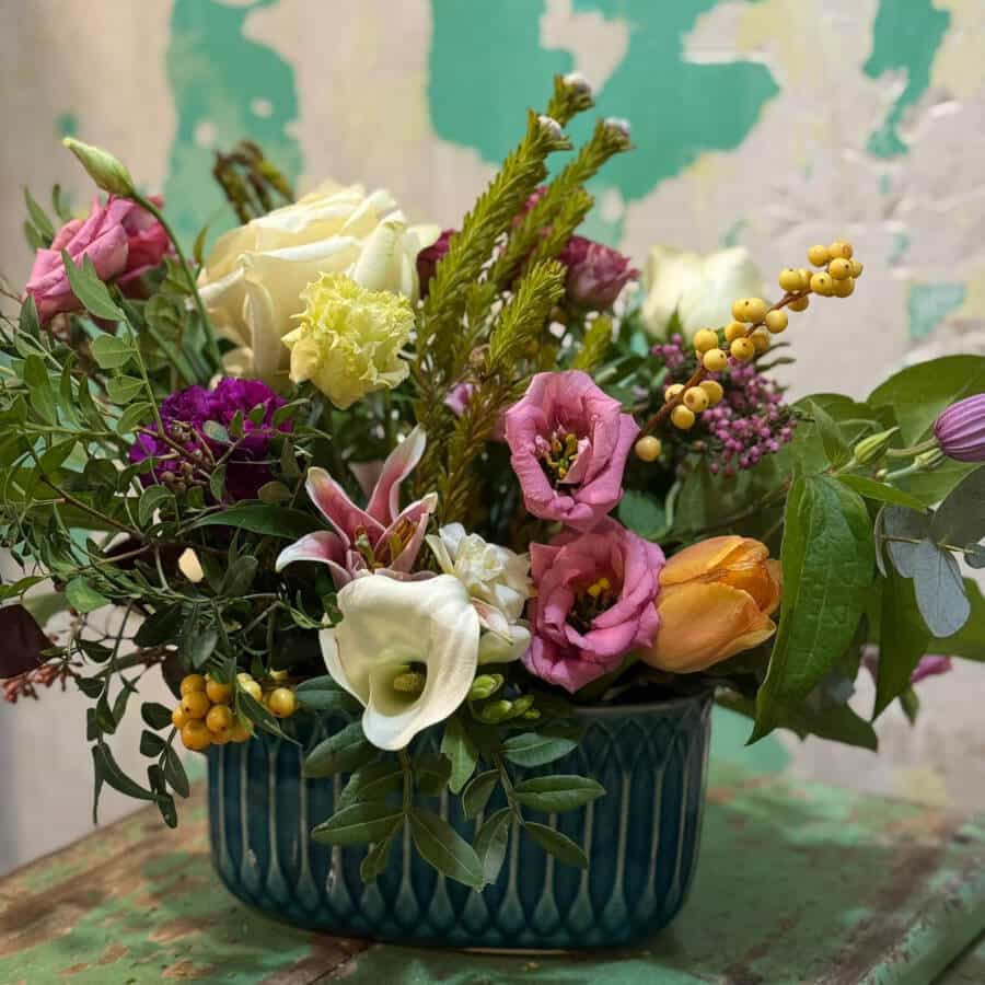 Este precioso arreglo con flores silvestres en maceta de terracota, es ideal como centro de mesa. Esta compuesto de una gran variedad de verdes africanos, eucalipto, lentisco, flor de cera, erica, craspedia, lisianthus…