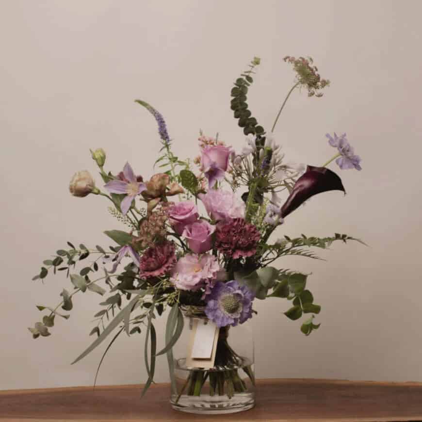 The Ángela Bouquet is a celebration of nature’s elegance, designed to bring a sense of countryside charm into any space. Crafted with soft lavender and mauve tones, it reflects the beauty of a wildflower meadow in bloom. The gentle greens and delicate white blossoms enhance the composition, creating a romantic and relaxed atmosphere.