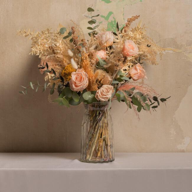 Pompeya es quizás uno de los ramos estrella de Adhoc Flores. Confeccionado de forma integra por flores preservadas, este bonito ramo incluye una elegante combinación de rosas, eucaliptos y pampas entre otras especies florales.