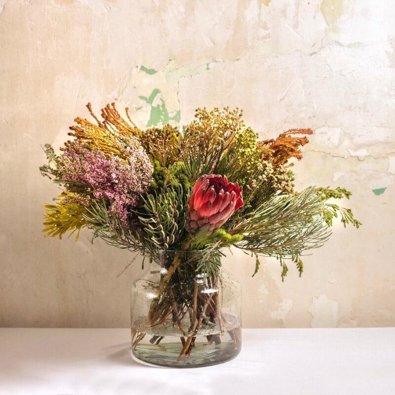 Confeccionado con muchísimo mimo, incluye variedades de verdes africanos, proteas, brunias y escabiosas entre otras especies… Te sorprenderá su gran duración y lo bien que permanece al dejarlo secar. Puedes acompañarlo de forma opcional con un jarrón de cristal igual o similar al mostrado en las imágenes.